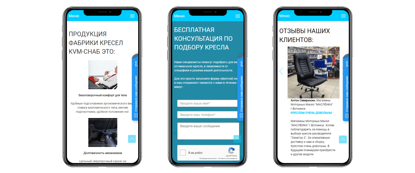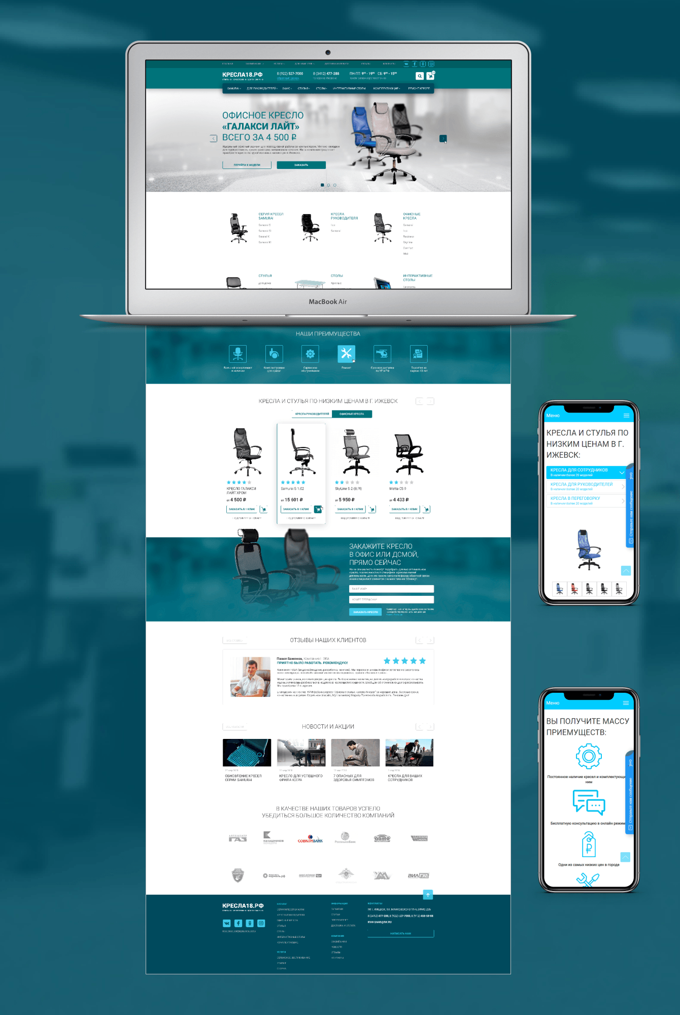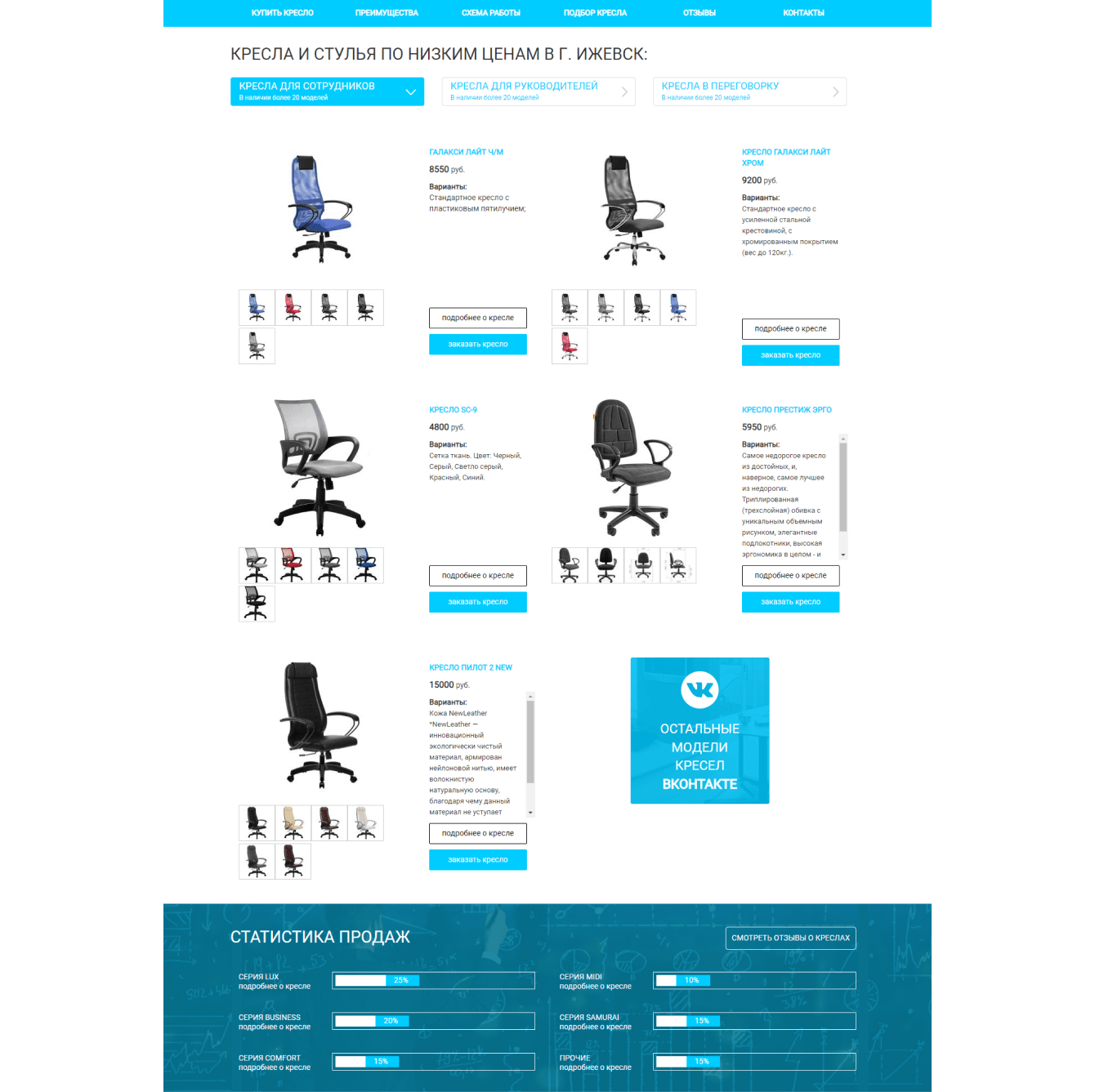 На этом этапе мы сосредоточились на удобстве и комфорте клиентов. Разделили кресла на категории. Выставили статистику продаж. Показали преимущества и, конечно, отзывы клиентов, что ведет к доверию будущих заказчиков.
