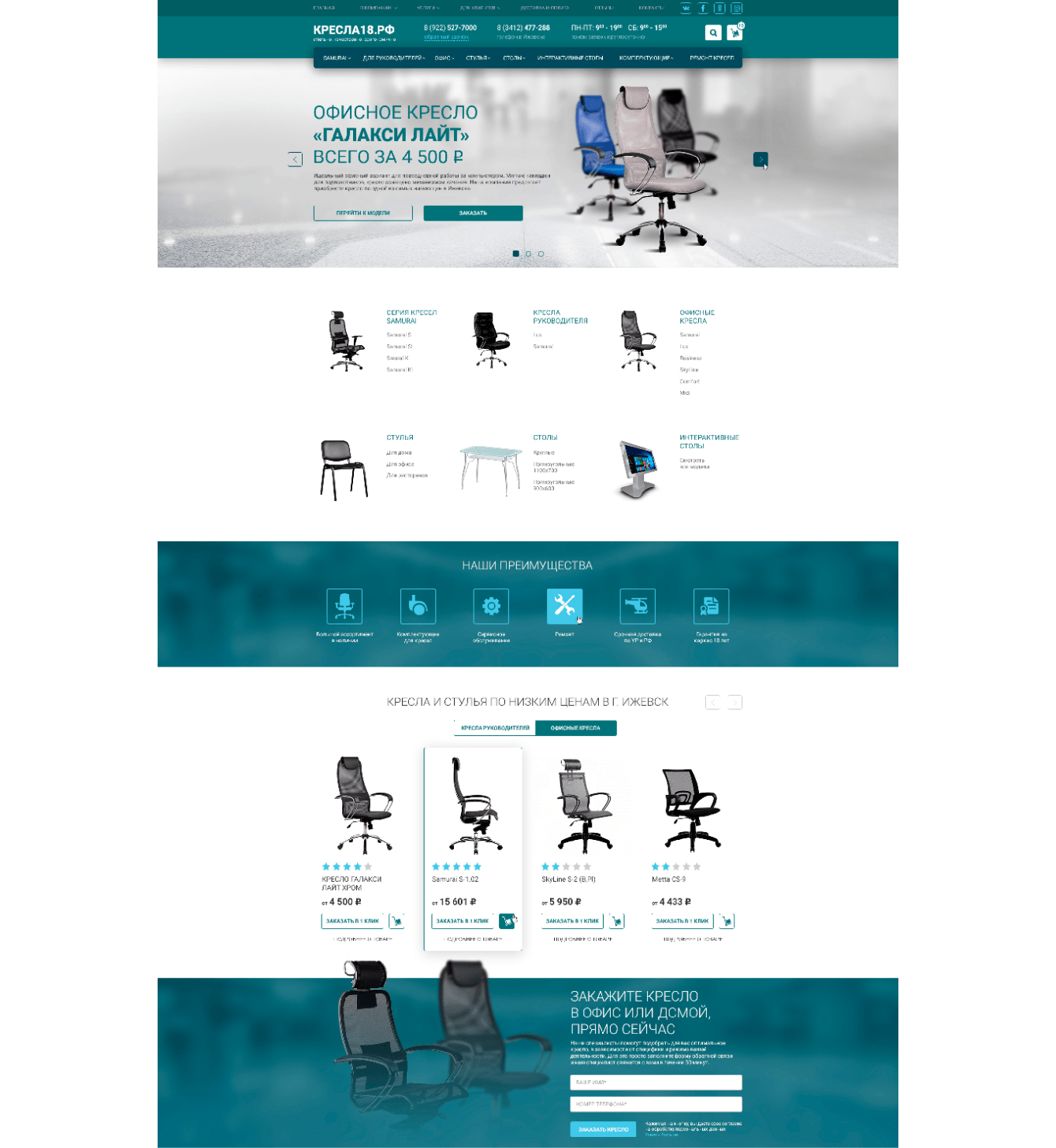 Дизайн интернет-магазина решили оставить как в лендинге. В шапке сайта добавили удобное навигационное меню, контактную информацию и режим работы. Изменили логотип компании. Добавили сложную карточку товара, где цена зависит от цвета изделия, цвета и материала корпуса и формы колес для кресла.