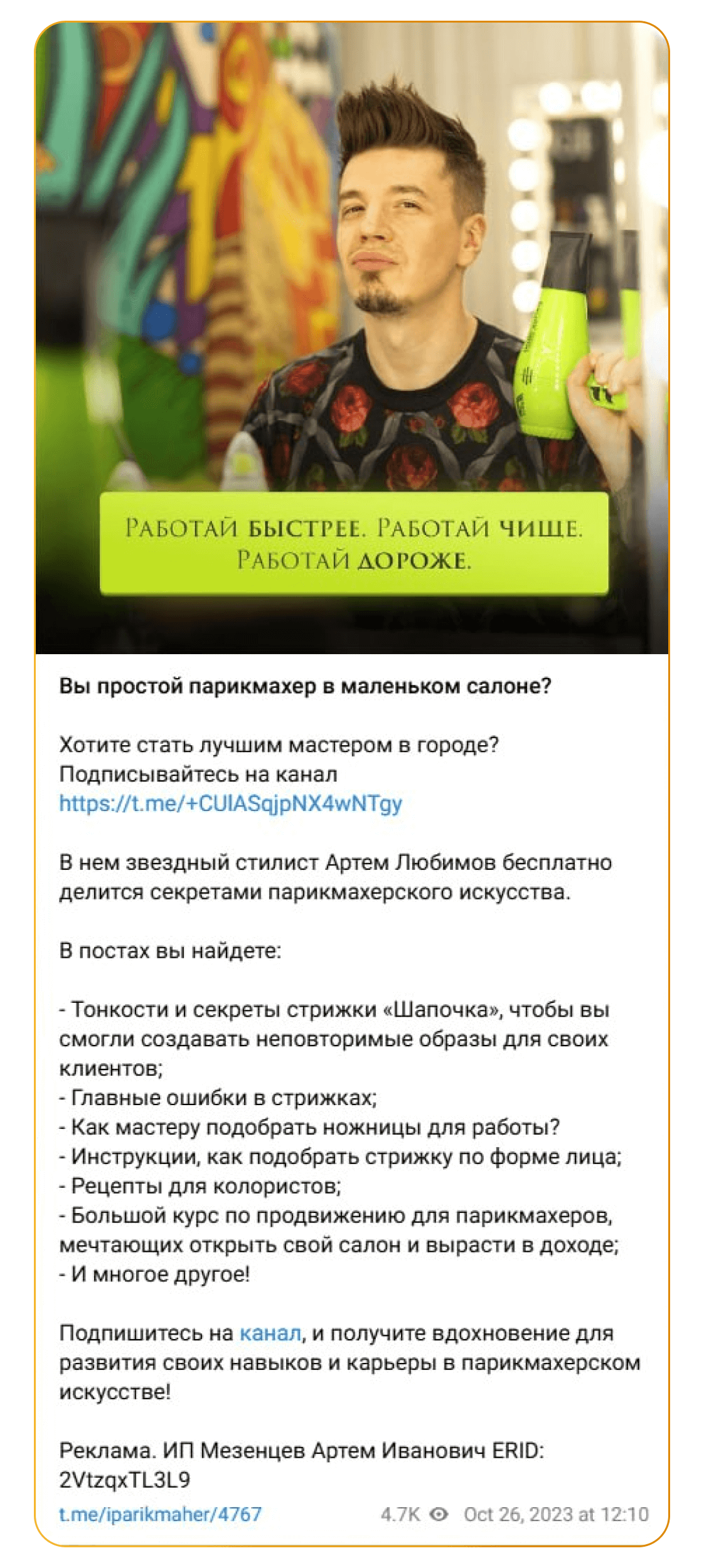 В итоге в нише обучения парикмахеров нашли 5 каналов, готовых к сотрудничеству. Из них только 2 канала смогли оформить маркировку рекламы и являлись ИП. Посевы в каналах физлиц не рассматривали, так как такая форма сотрудничества была неудобна заказчику.