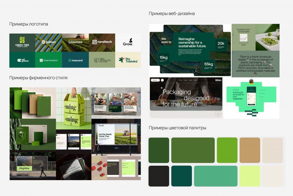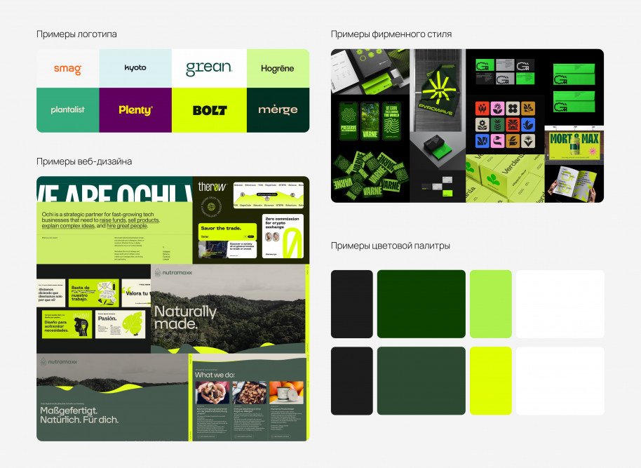 - в цветовой палитре один акцентный травянисто-зеленый или желтый цвет поддерживается темным зеленым и черно-белой базой.