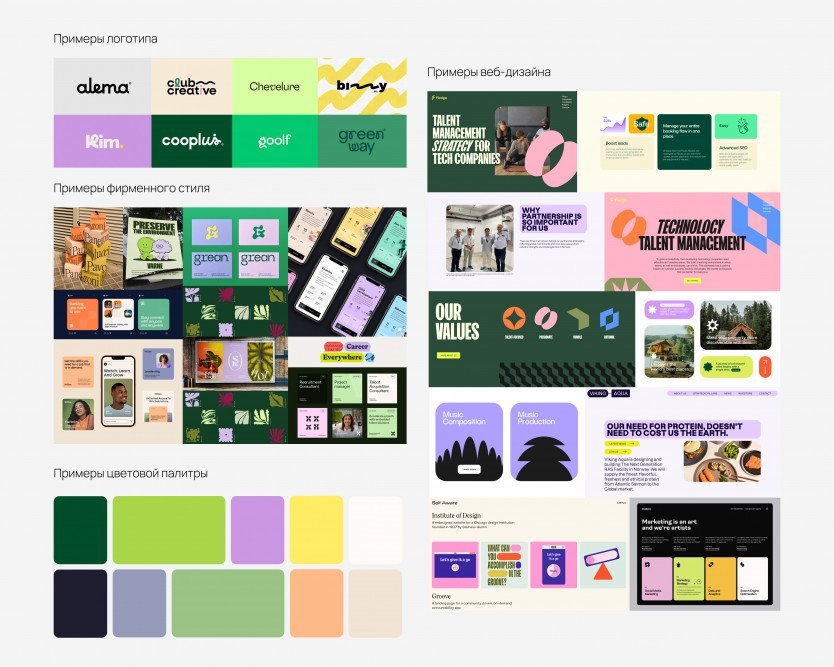 Айдентика будет использоваться на сайте, в соцсетях, на товаре и упаковке, в маркетинговых материалах. Поэтому в референсах мы показали, каким может быть лого, фирменный стиль на печатных носителях и в веб-дизайне.