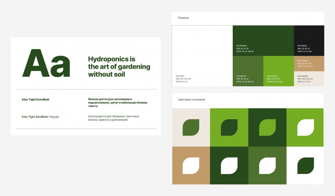 Чтобы сделать прямую отсылку к роду деятельности компании, опорными элементами добавили листья и воду. Клиент выбрал последний вариант логотипа с вынесенным дизайн-элементом и первую палитру.