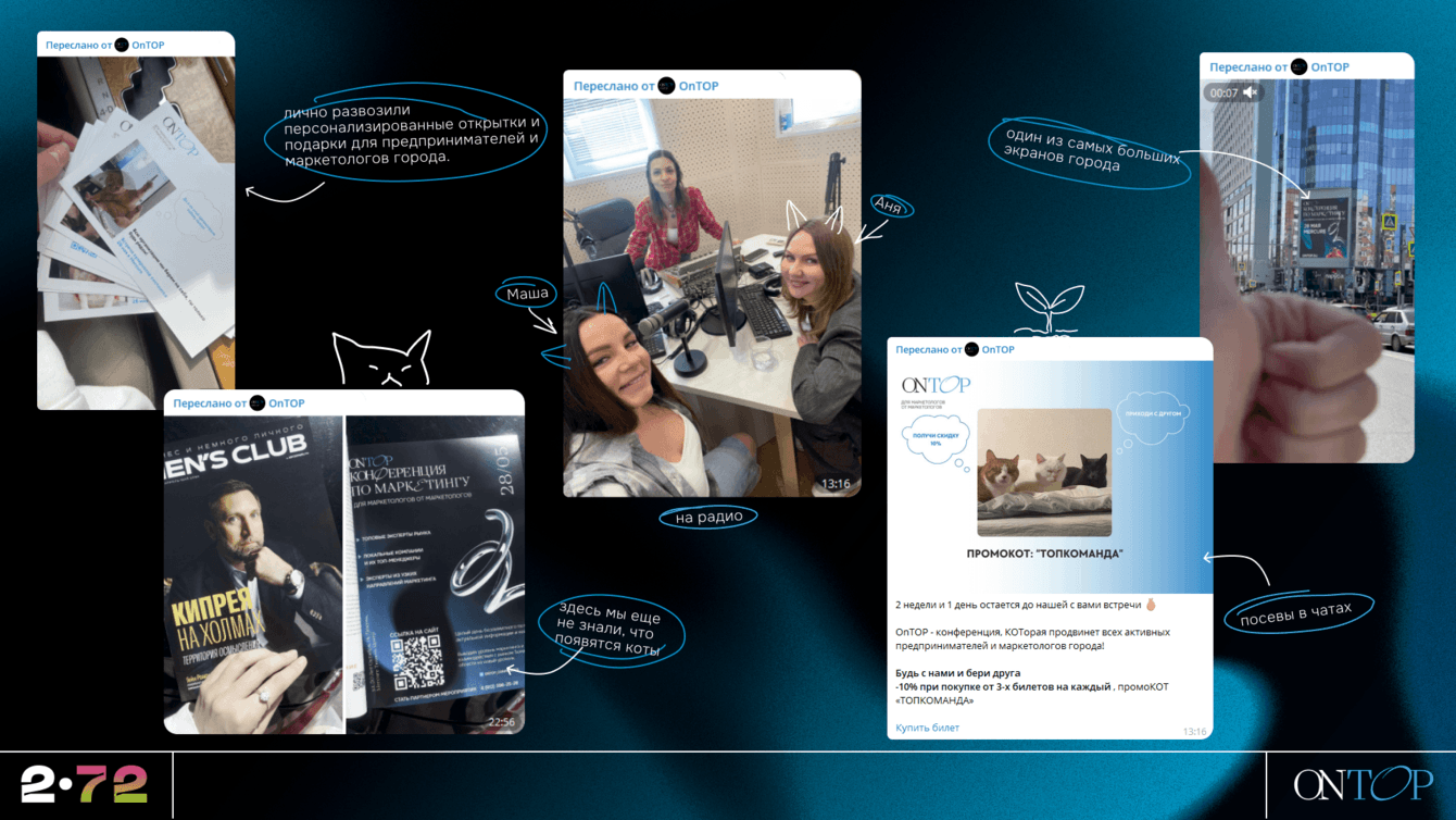 3) Индивидуальные приглашения блогерам (маркетологи на них обычно подписаны): лично развозили персонализированные открытки и подарки для предпринимателей и маркетологов города.