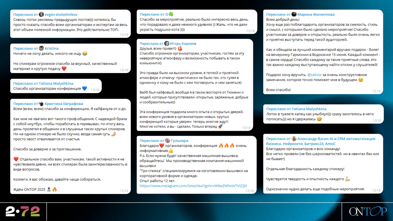 Конечно, не обошлось без нюансов - были и больные отзывы, но на OnTOP 2024 мы получили драгоценный опыт и уроки, чтобы подготовка и проведение OnTOP 2025 прошли ещё лучше.