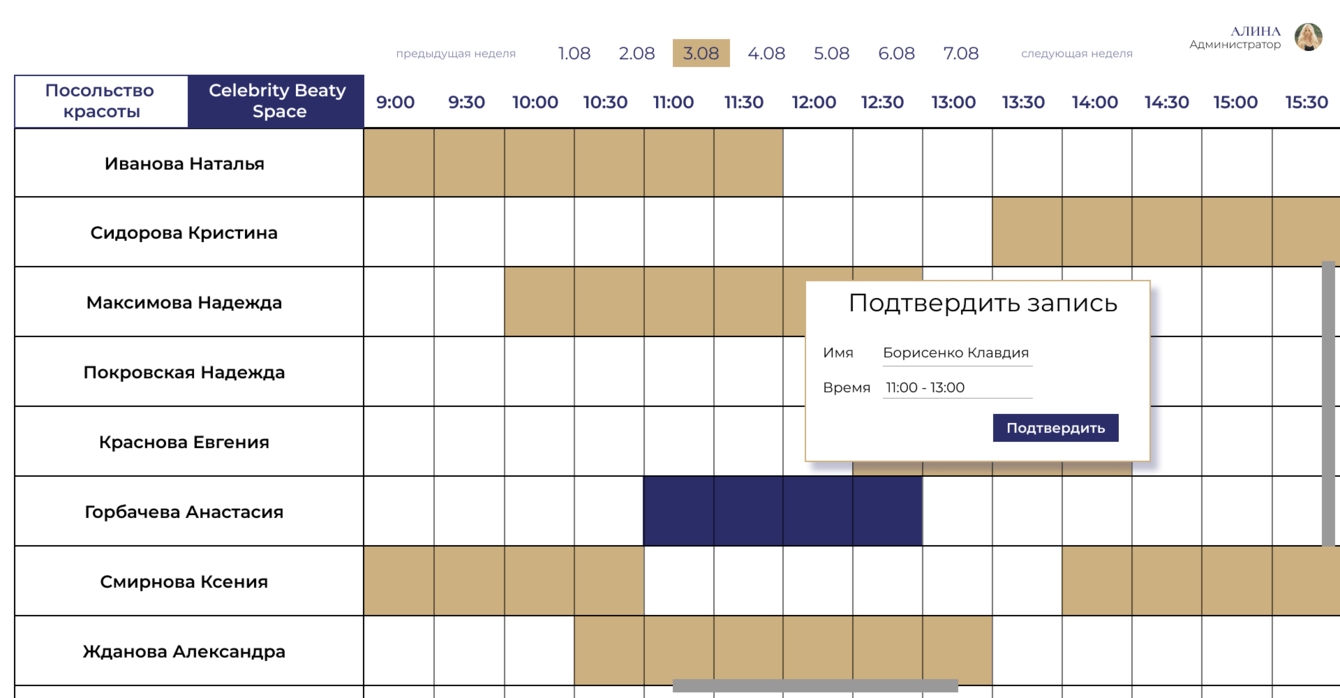 Данный вариант оказался дорогостоящим в реализации, поэтому клиент выбрал сервис yclients для записи, с условием, что чуть позже мы введем собственную систему записи. Согласно этому мы изначально в основе сайта заложили возможность реализации такой таблицы, на будущее.