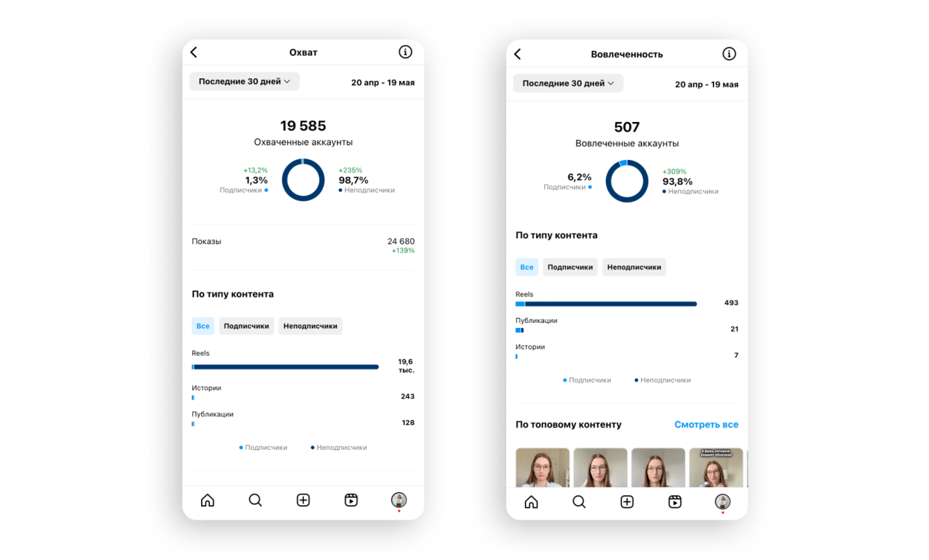 За отчетный период охват аккаунта увеличился на 220%, вовлеченность на 236% благодаря регулярному постингу историй и Reels.