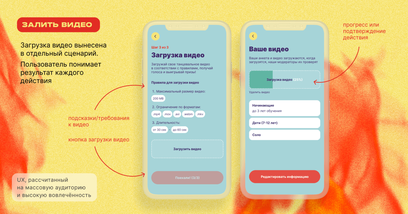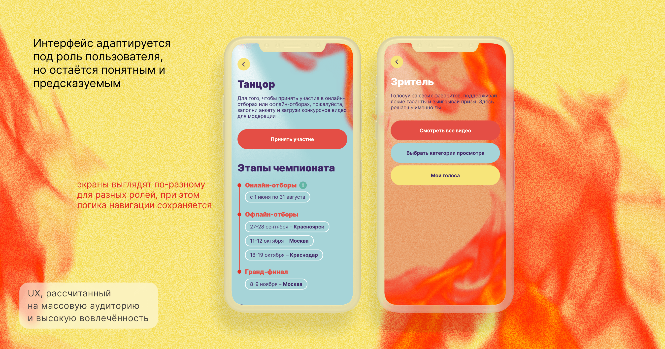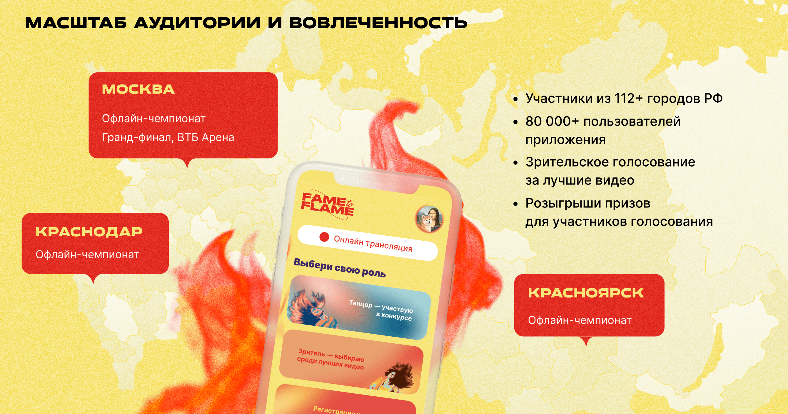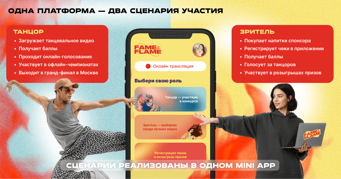 Fame to flame — федеральный танцевальный чемпионат. Задача проекта VK Mini app в рамках чемпионата — предоставить удобную платформу для регистрации чеков, загрузки танцевальных видео, голосования и проведения розыгрышей призов.