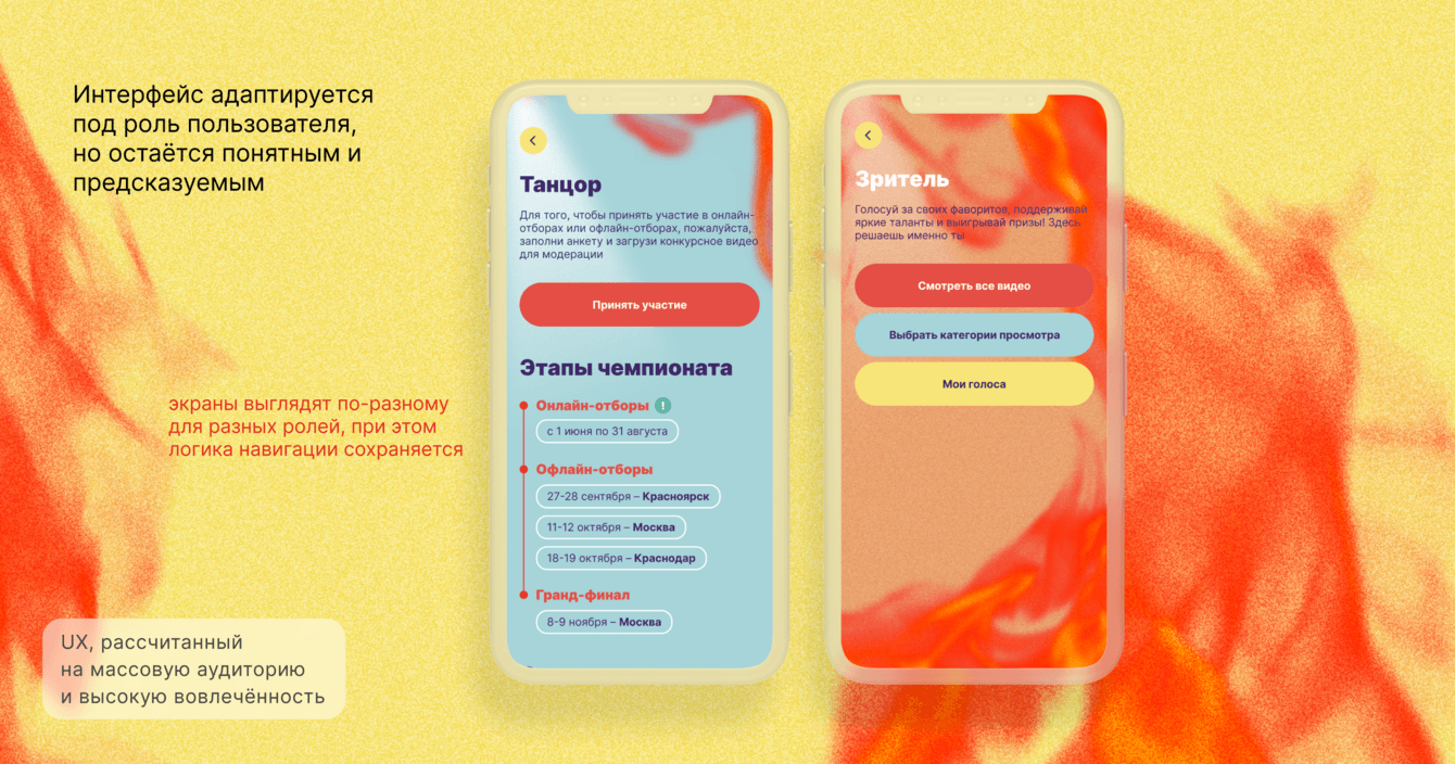 ‣ разработали удобный интерфейс с цветовым кодированием ролей, чтобы легче было понять, как работает конкурсная механика: где зарегистрироваться, как залить видео, где посмотреть призы.