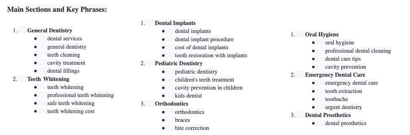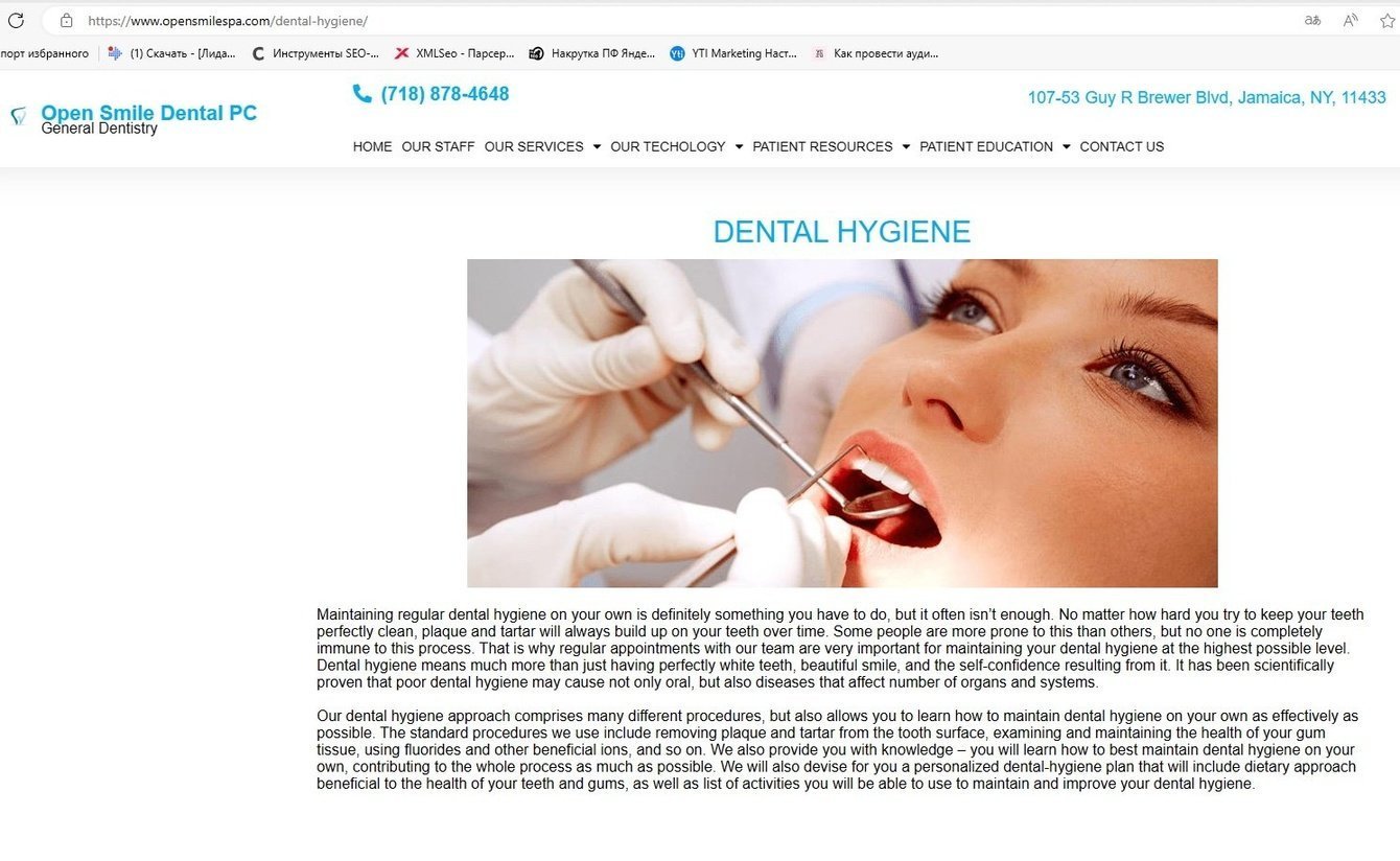Как и всегда, мы начали со знакомства с проектом. Клиника “Open Smile”, расположенная в Нью-Йорке, предлагала широкий спектр стоматологических услуг, включая общую стоматологию, косметическую стоматологию, импланты, ортодонтию и другие. Они акцентировали внимание на качественном уходе, обучении пациентов и создании дружелюбной атмосферы. Их команда стремится помочь пациентам поддерживать хорошее здоровье полости рта и добиться красивой улыбки.