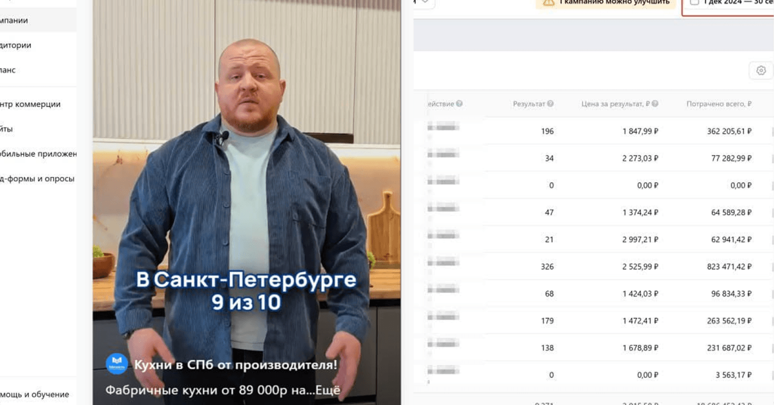 При росте CPL быстро обновляли креативы по новым ТЗ. Мы меняли не только визуалы, но и подачу офферов, тексты, заголовки. Иногда приходилось обновлять креативы по нескольку раз в месяц, чтобы удерживать CPL, стоимость замера и СAC. Такой системный подход позволил держать стабильность даже при росте бюджетов.