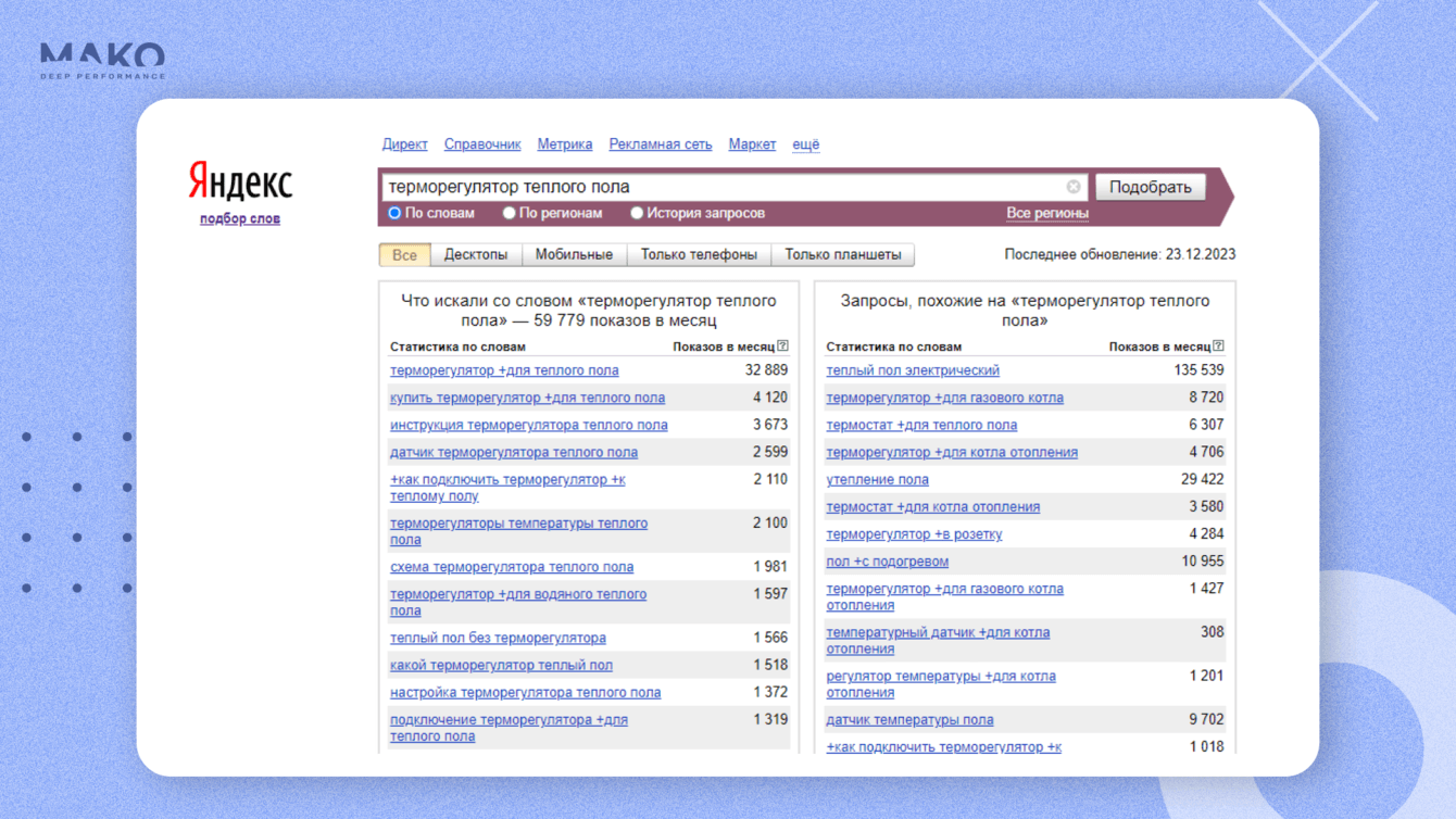 Чтобы карточка попала в ТОП поиска она должна содержать востребованные и соответствующие товару ключевые фразы в названии, описании и характеристиках. Релевантные ключи мы искали с помощью трех сервисов: Wordstat (сервис для поиска информации о запросах пользователей), Google Ads планировщик (инструмент контекстной рекламы) и MarketGuru (сервис аналитики для МП).