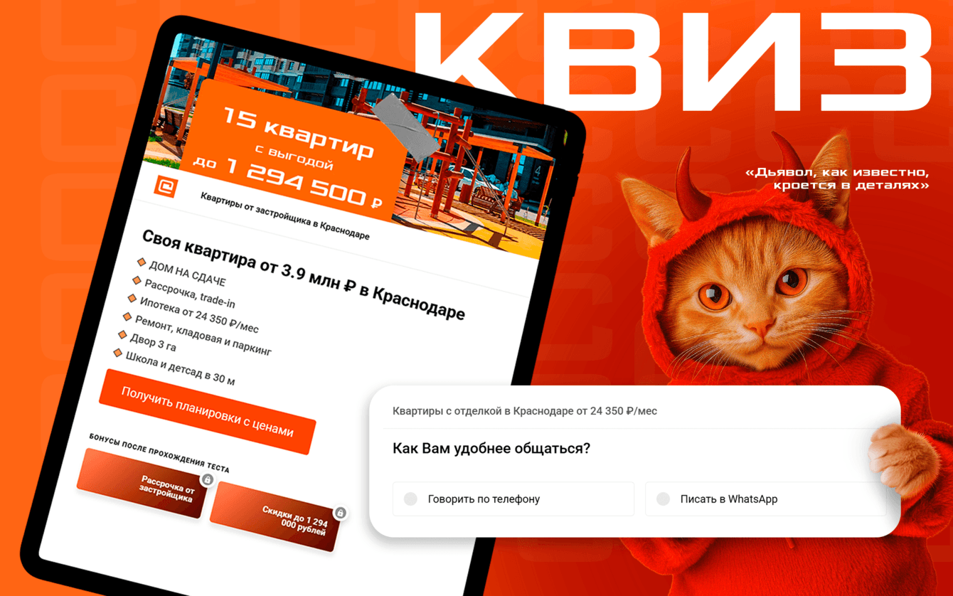 Дьявол, как известно, кроется в деталях. И эта маленькая деталь — допвопрос. После обсуждения вариантов коммуникации отдела продаж в качестве теста в квиз был добавлен вопрос о способе связи: по телефону или в WhatsApp. Не прогадали. Переписываться в мессенджерах клиентам удобнее. А удобство повышает лояльность и заинтересованность в объекте. Так, конверсия выросла с 38,17% до 52,99% (данные CRM-системы).