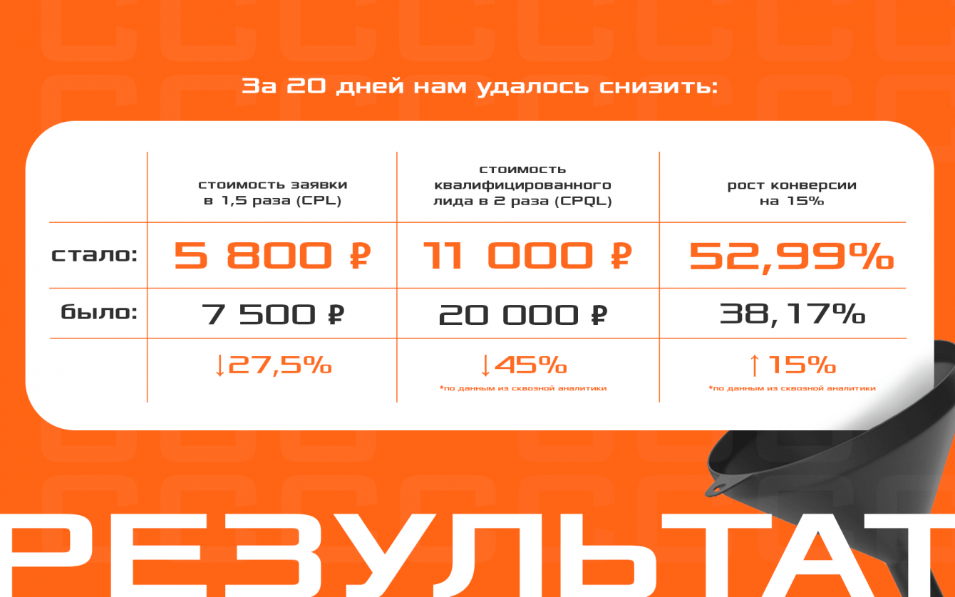 • стоимость квалифицированного лида в 2 раза (CPQL)