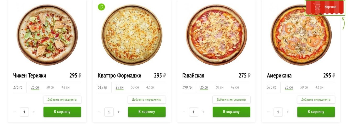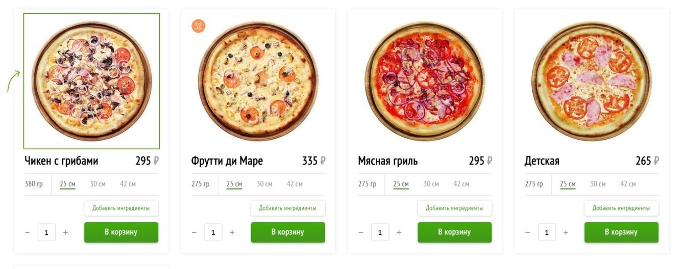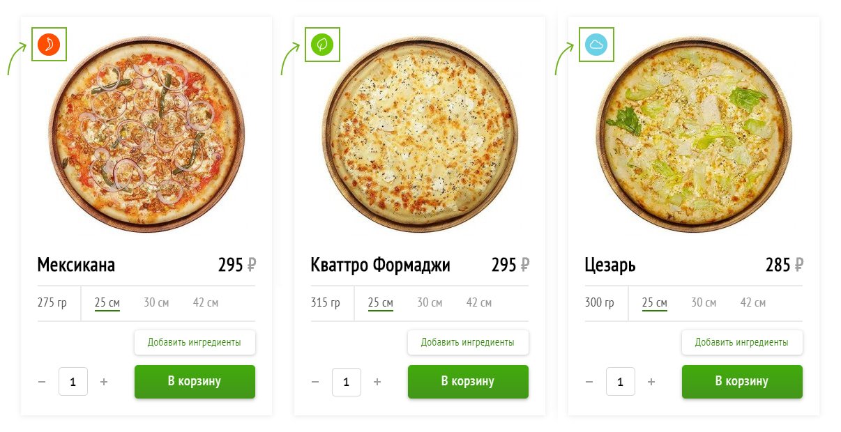 Если добавить иконки к пиццам на сайте (детская, острая, сытная, без мяса, с морепродуктами, диетическая), конверсия увеличится.