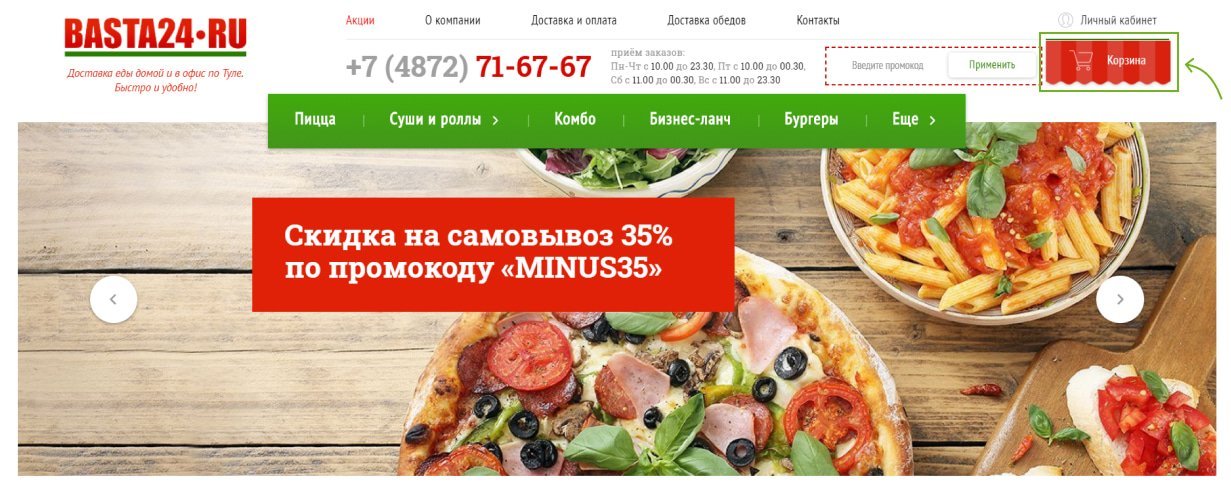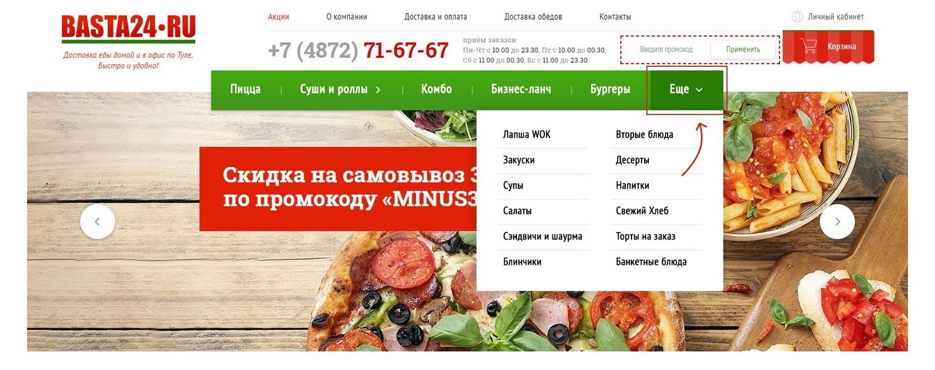 Баста 24 — служба доставки еды в Туле. Работали вместе с 2013 года: разработали редизайн сайта, занимались SEO-продвижением и вели рекламу. Для комплексной работы над повышением прибыли клиента решили поработать с помощью тестирования различных гипотез, в том числе используя функционал Google Optimize.