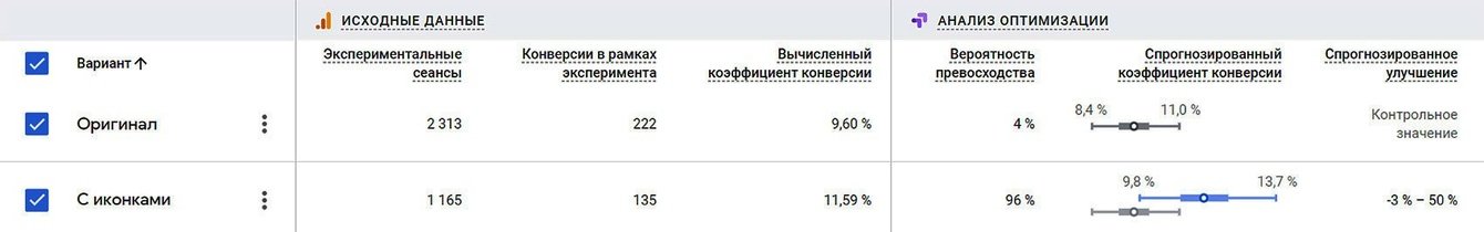 На базе 3519 посещений за 14 дней эксперимента конверсия сайта с иконками составила 11,6% (повышение на 3%).