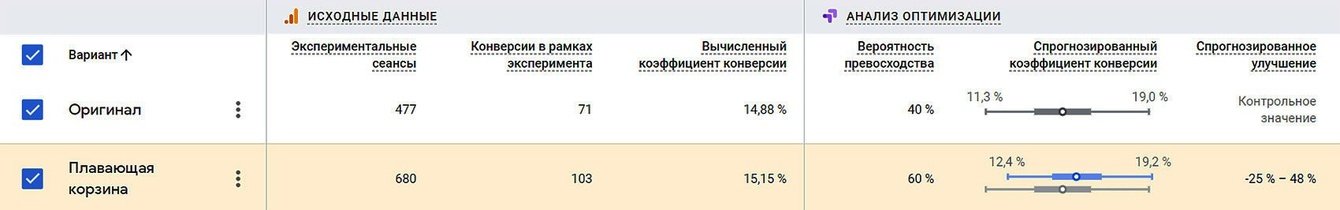Тест проводился в течении 12 дней на базе 1157 визитов. Конверсия в заказ с плавающей корзиной составила 15,6% (без плавающей 14,9%). Показатель отказов снизился на 2,1%.