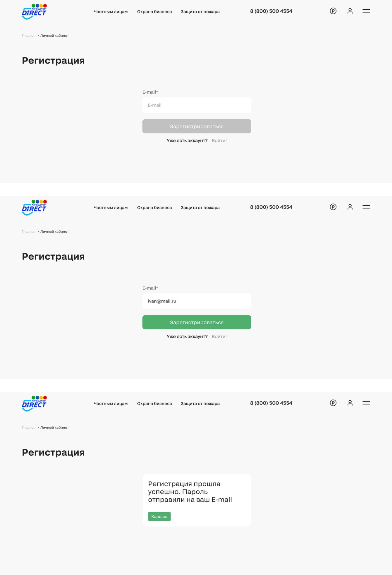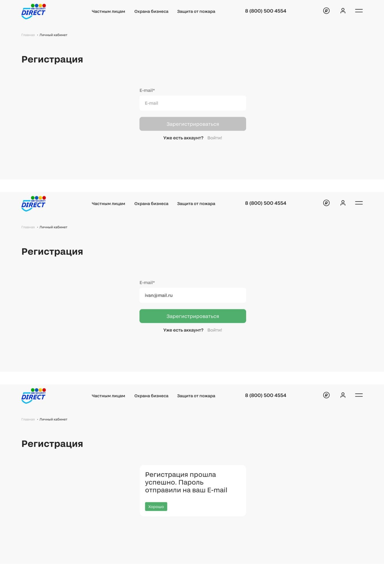 Для регистрации в личном кабинете пользователю необходимо указать email, который был использован при заключении договора. После проверки данных пользователь получает на почту инструкции для авторизации.
