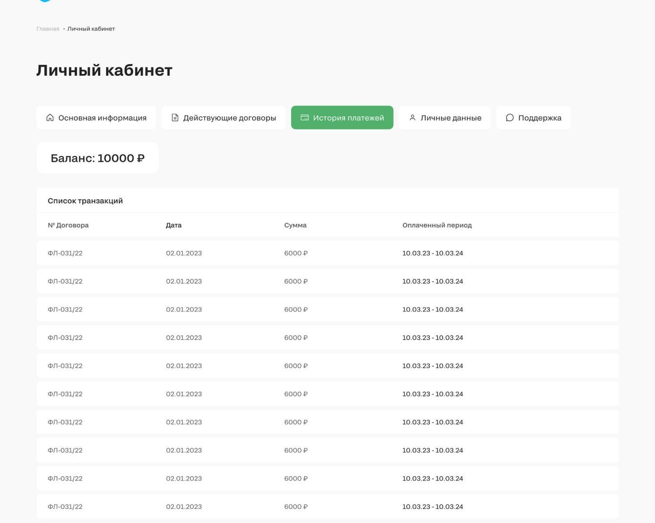 В личном кабинете доступна полная история всех транзакций по каждому договору.