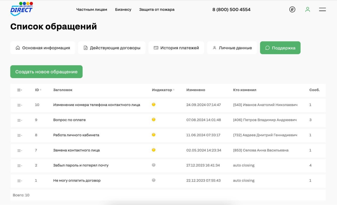 Для удобства клиентов была реализована возможность отправки обращений в службу технической поддержки прямо из личного кабинета.