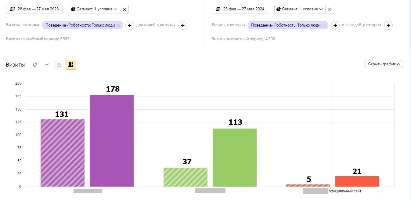 Комплексные действия по управлению репутацией компании нашего клиента привели к заметному увеличению числа визитов по брендовым запросам.