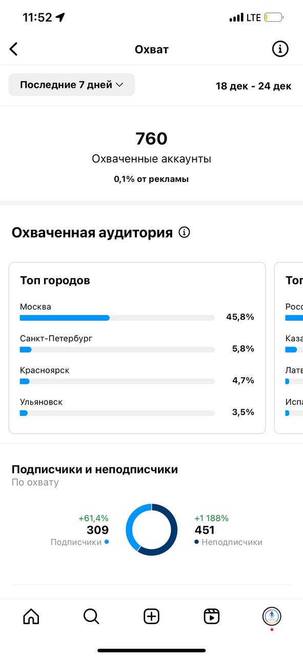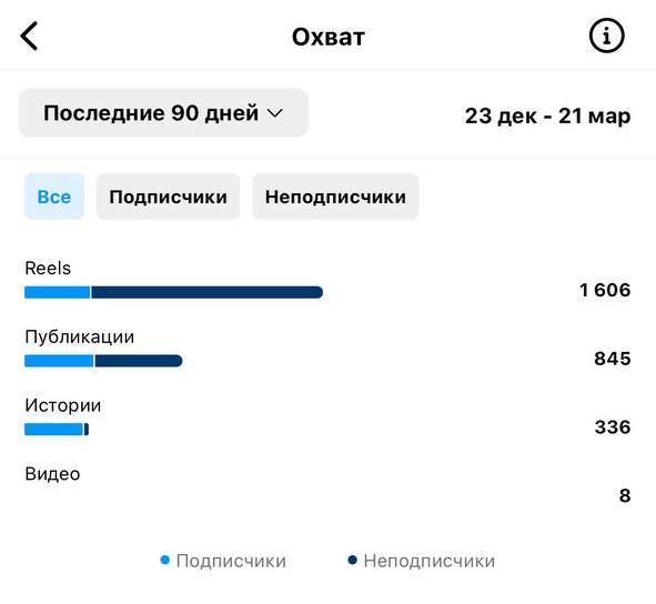 — контент получает высокие охваты благодаря Reels среди новой аудитории