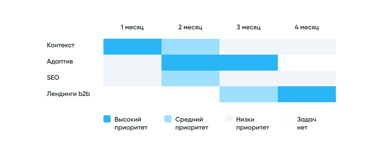 Мы решили двигаться по 4 направлениям: использовать контекстную рекламу, создать адаптив для мобильных устройств, заняться SEO продвижением и разработать лендинг для B2B. Получился такой план: