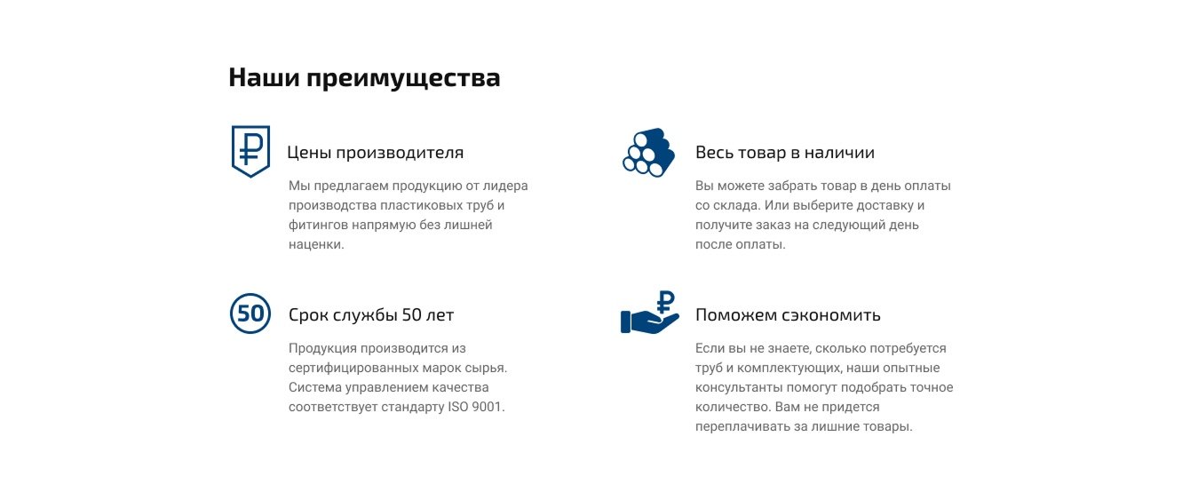Стабильная логистика. При работе с европейскими производителями поставки нередко задерживались, а в период ковида и вовсе приостановились. Объясняем на сайте, что поставляем в срок, у нас быстрая и недорогая логистика по РФ.