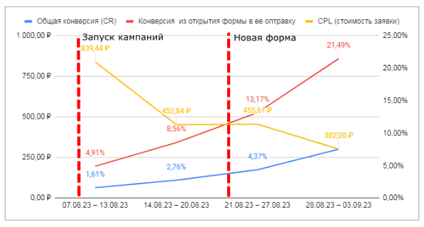 1. Увеличили конверсию из открытия формы в ее заполнение и отправку в примерно 3 раза (с 5 до 13%). Пропорционально выросла конверсия в целевой визит с 1,5 до 6%