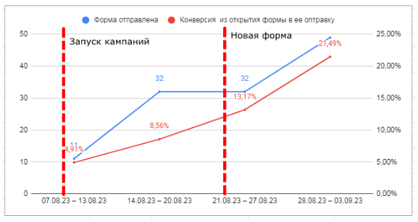 1. Увеличили конверсию из открытия формы в ее заполнение и отправку в примерно 3 раза (с 5 до 13%). Пропорционально выросла конверсия в целевой визит с 1,5 до 6%