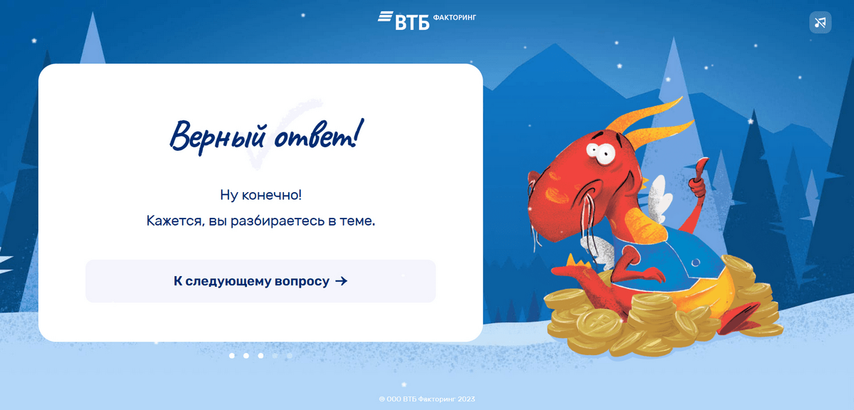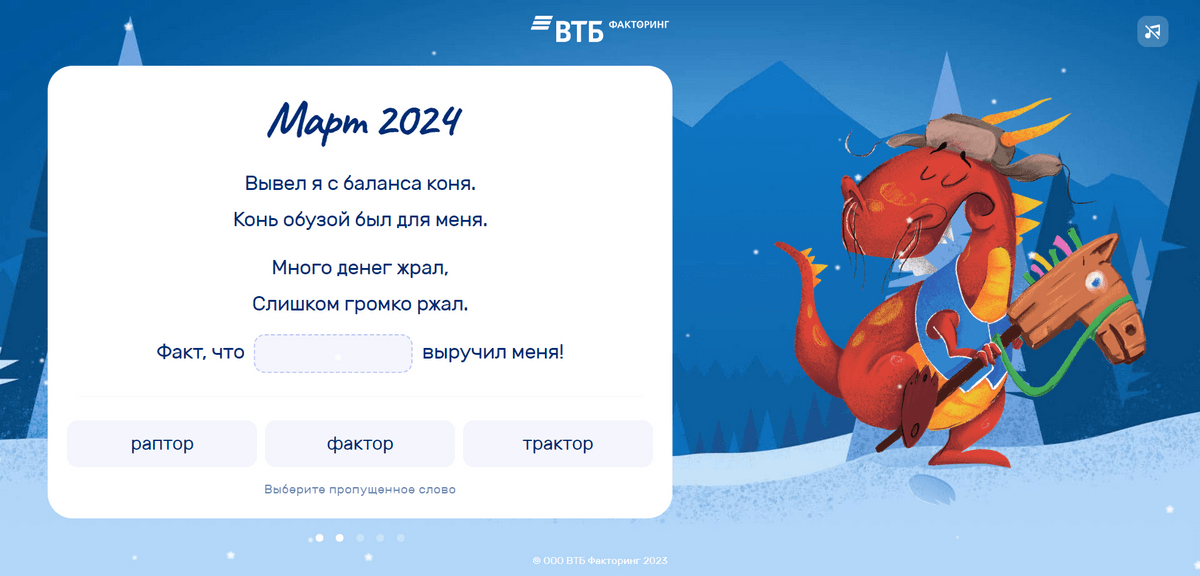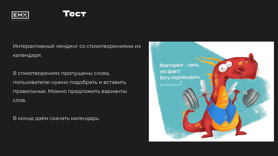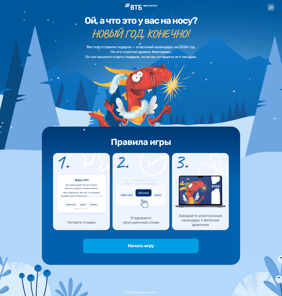 Затем мы придумали сюжет и заодно имя для главного персонажа: ВТБ Факторинг подготовил подарок, но его украл дракон Факторикс. Тем, кто пройдёт квиз, Факторикс отдаст календарь. Чтобы получить его, нужно оставить почту.
