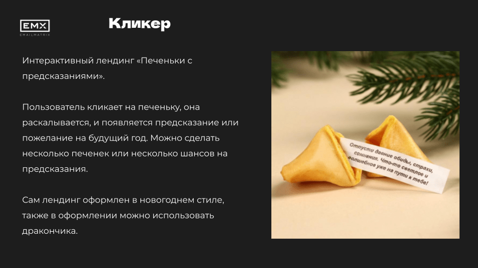 Спасибо команде EMAILMATRIX за то, что помогли создать новогоднее настроение нашим клиентам. Мы получили ровно то, что хотели — лёгкий поздравительный лендинг с простой механикой.