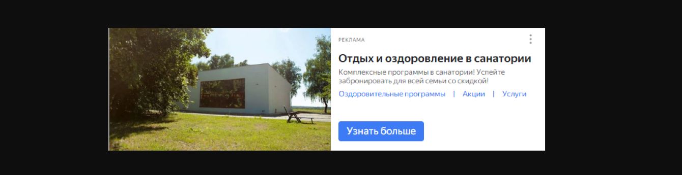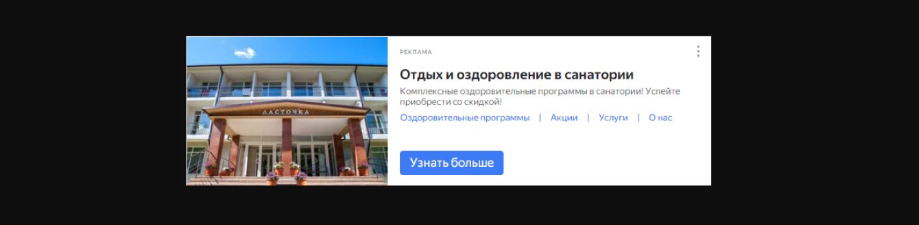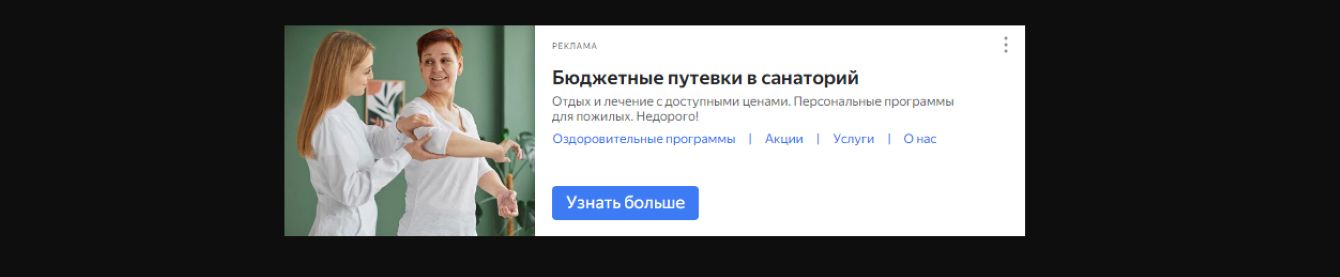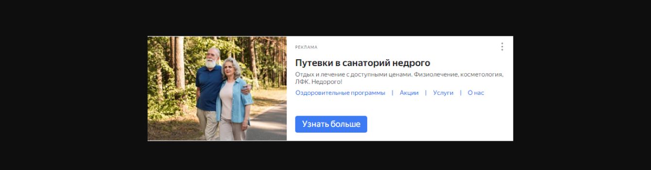 На все сегменты целевой аудитории транслировалось одно и тоже рекламное предложение -- поэтому тексты состояли из общих фраз, никого не «цепляя за живое». Мы проанализировали пользовательскую аудиторию на сайте санатория, разбили ее на сегменты и составили для каждого отдельное предложение.