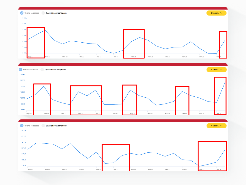 По данным «Вордстат», сезонный спрос на ключевые направления (краска для кожи, реставрация кожаных изделий, ремонт кожаных сидений авто) имеет выраженный рост весной и осенью, при снижении активности в летний период.