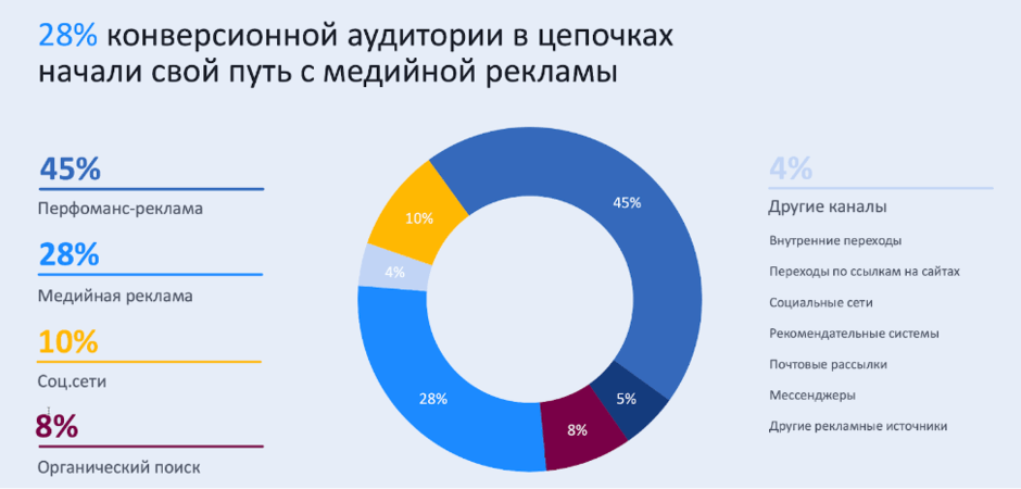 Как итог, 28% конверсионной аудитории начали свой путь с медийной рекламы. Плюс CPA в конверсионных цепочках была ниже на 26%, если она начиналась с медийной рекламы.