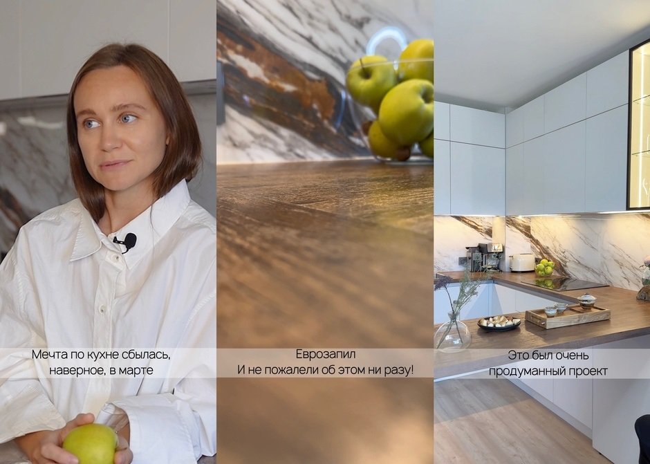 Для видеорекламы мы выбрали ролик, где хозяйка кухни рассказывает о взаимодействии с заводом и своих впечатлениях от гарнитура. В это время на экране крупным планом показаны основные детали проекта. Такая реклама должна наглядно продемонстрировать успешный результат работы и, тем самым, повысить доверие аудитории к бренду.