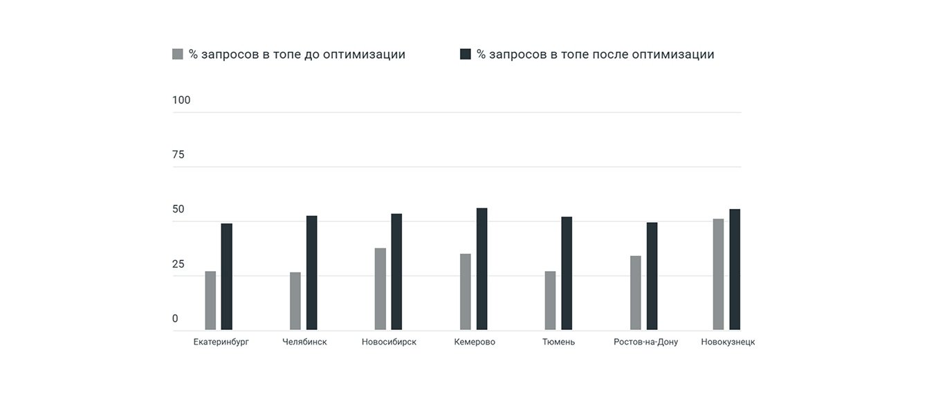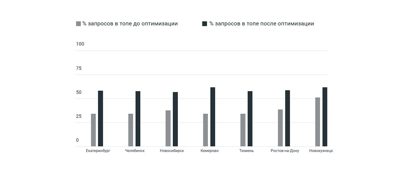 Во всех регионах действуют разные акции. Мы подготовили тексты с учётом местных спецпредложений и добавили туда региональные ключевые слова. За счёт этого страницы стали лучше ранжироваться в указанных городах.