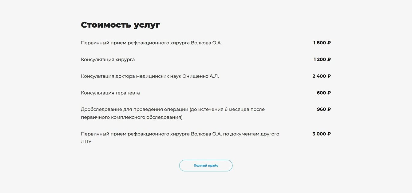 Далее пациент автоматически попадает на страницу, где представлена адаптированная под его регион информация о клинике, услугах и их стоимости.