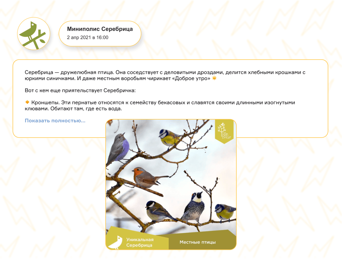 — Внедрили маскота — птицу Серебрицу — благодаря которой миниполис ярко выделяется среди других девелоперских проектов, а также вовлекает читателей в контент.