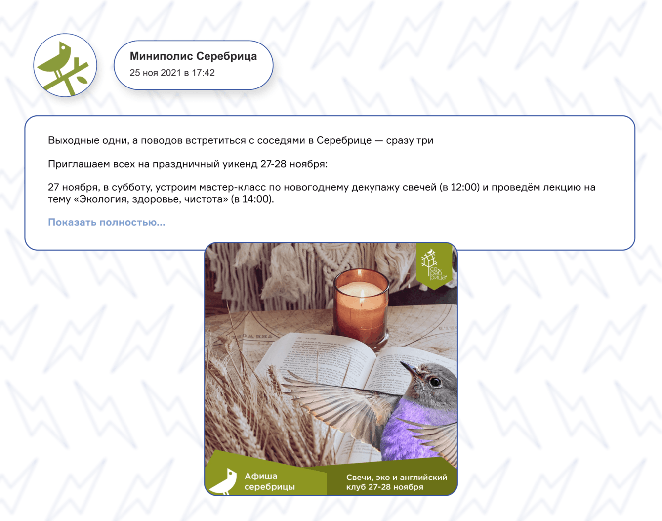 — Используем разноформатный контент и добавляем жизни в действия маскота с помощью моушнов. Поддерживаем соседские инициативы и освещаем жизнь миниполиса.