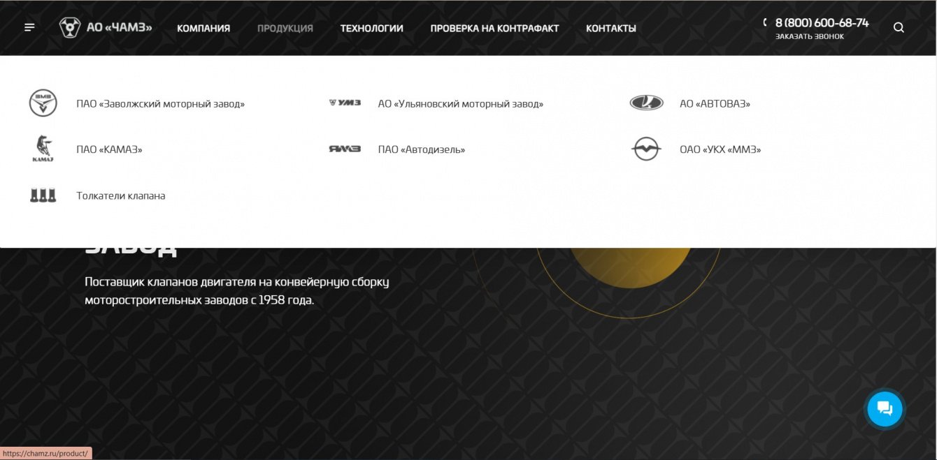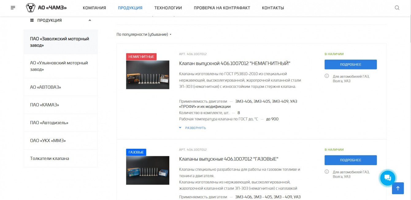 Мы полностью поменяли главную страницу, сделав акцент на ведущих разделах сайта для удобства навигации и отразив, что компания имеет имя и многолетние наработки в этой сфере - “поставщик клапанов двигателя на конвейерную сборку моторостроительных заводов с 1958 года”.