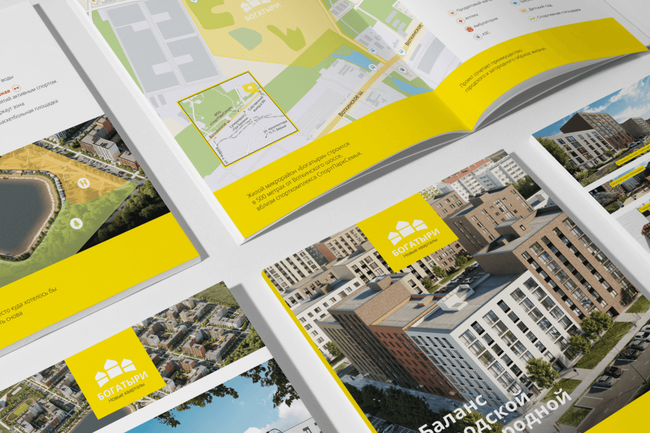 Презентационные материалы получились уютными, но в тоже время сочными и богатыми на архитектурные решения, как и сам “Микрорайон Богатыри”.