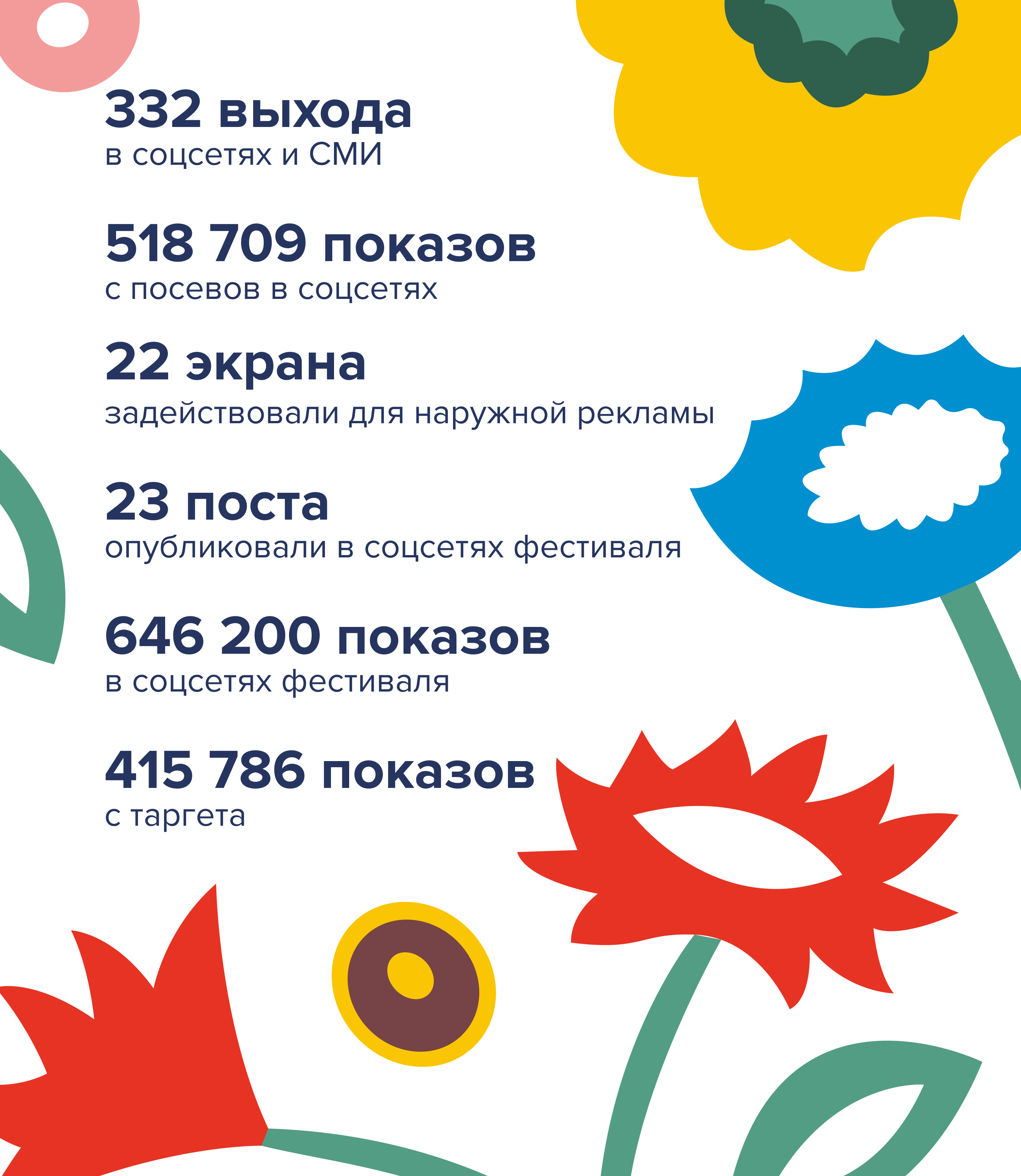 Договорились о посевах в соцсетях. Публиковались анонсы фестиваля, выступления хедлайнеров, детская программа, пострелизы. Охват посевов составил более 518 тысяч.