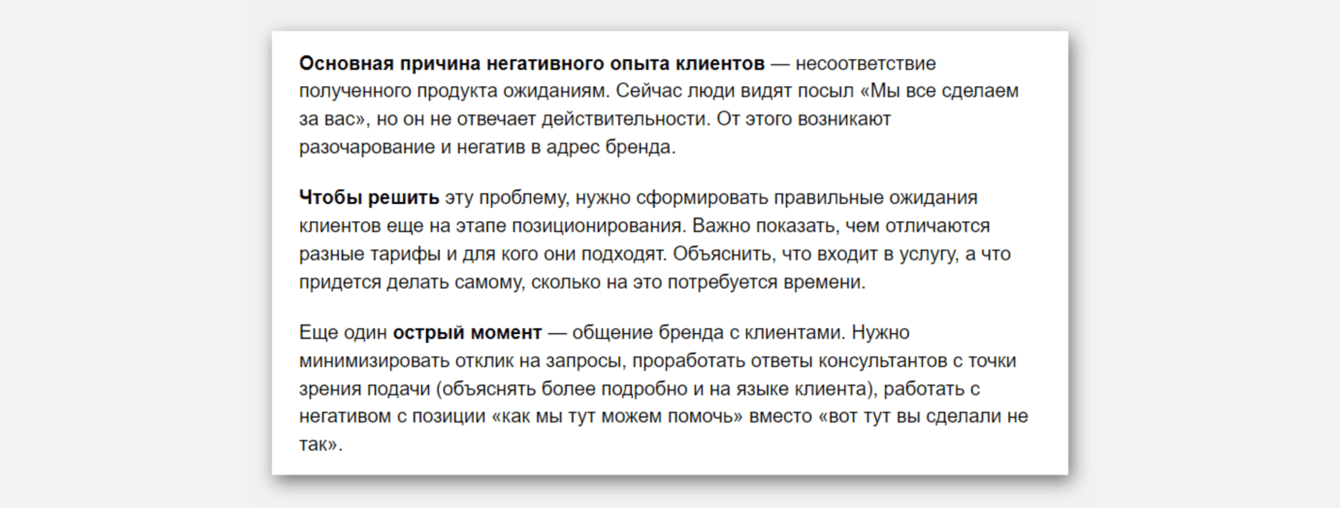 Коротко, понятно и не вызывает вопросов или непонятных эмоций. Четко передает ценность для клиента, говорит о его болях. По сути, это самый лучший ответ на любой бизнес-вопрос. Его хочет слышать любой предприниматель — нужно только доказать делом, что мы действительно разберемся.
