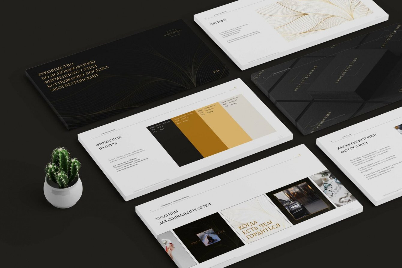 Айдентика проекта родилась из архитектурной концепции коттеджного поселка Фрэнка Райта, основанной на целостности и единении с природой. Поэтому в логотипе использованы простые понятные формы, строгий простой шрифт и приятные природные оттенки, которые перекликаются с цветами материалов, которые используются в строительстве «Swoy. Петровский».