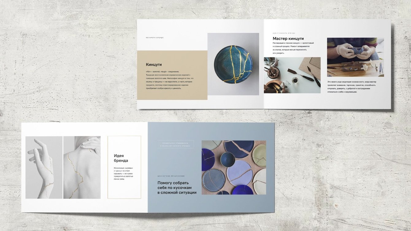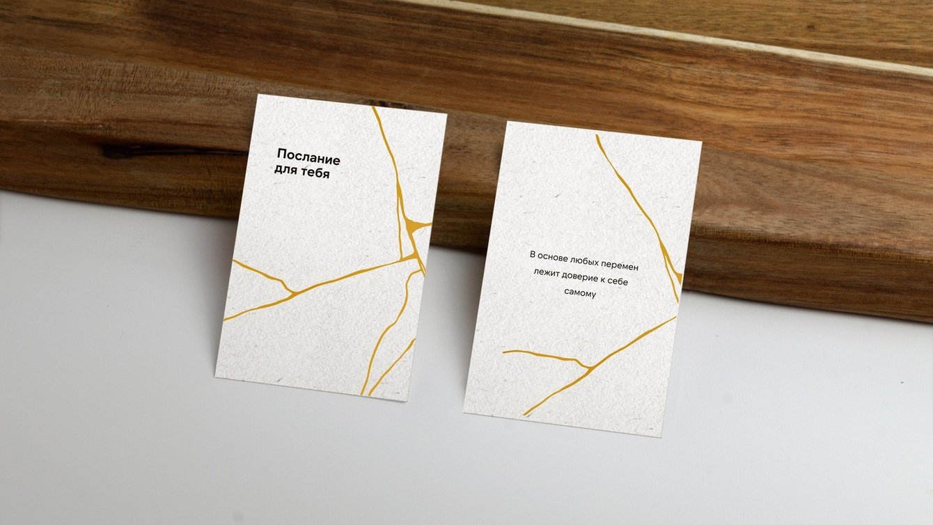 Также хочется отметить гибкость визуальной концепции: паттерн кинцуги можно использовать на любых носителях. Так у нас родилась красивая идея – дарить клиентам, прошедшим терапию, ювелирные украшения в стиле кинцуги как память о том сложном пути, который они преодолели.