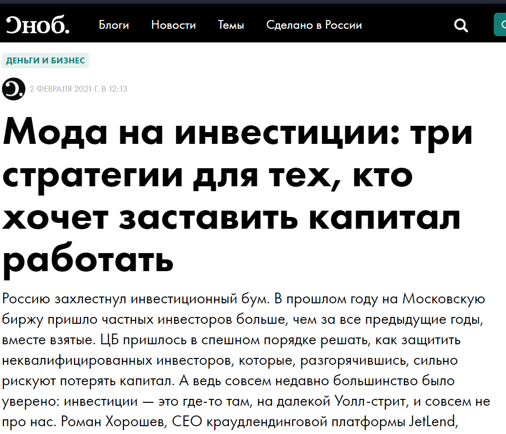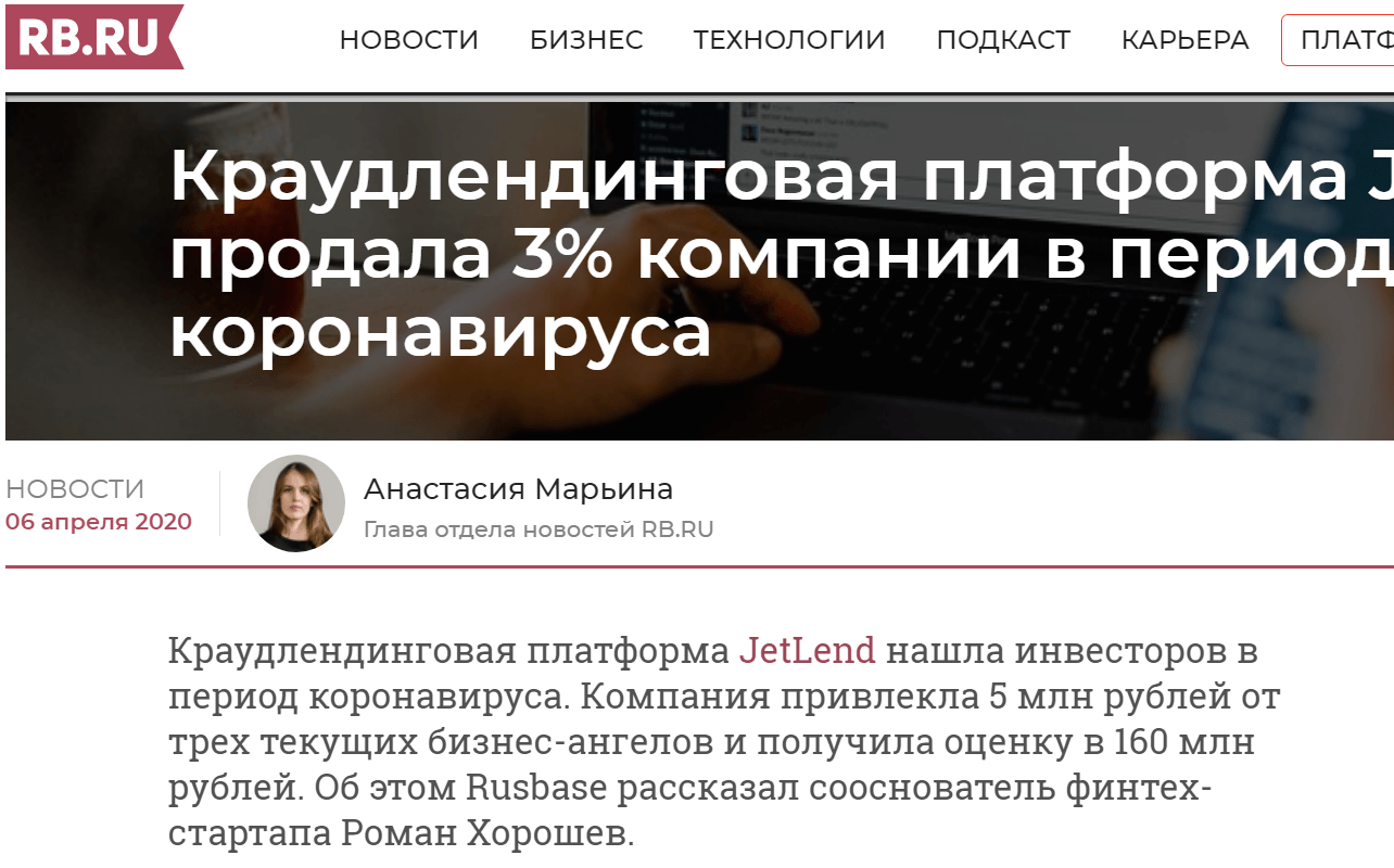 Первые публикации в СМИ, которые привлекли и первых же инвесторов на платформу. В самом старте у JetLend случился конфуз — инвестор, который планировал вложиться на самом старте, в последний момент отказался от договора без объяснения причин. Пришлось срочно искать первых инвесторов. Публикации в СМИ решали эту задачу.