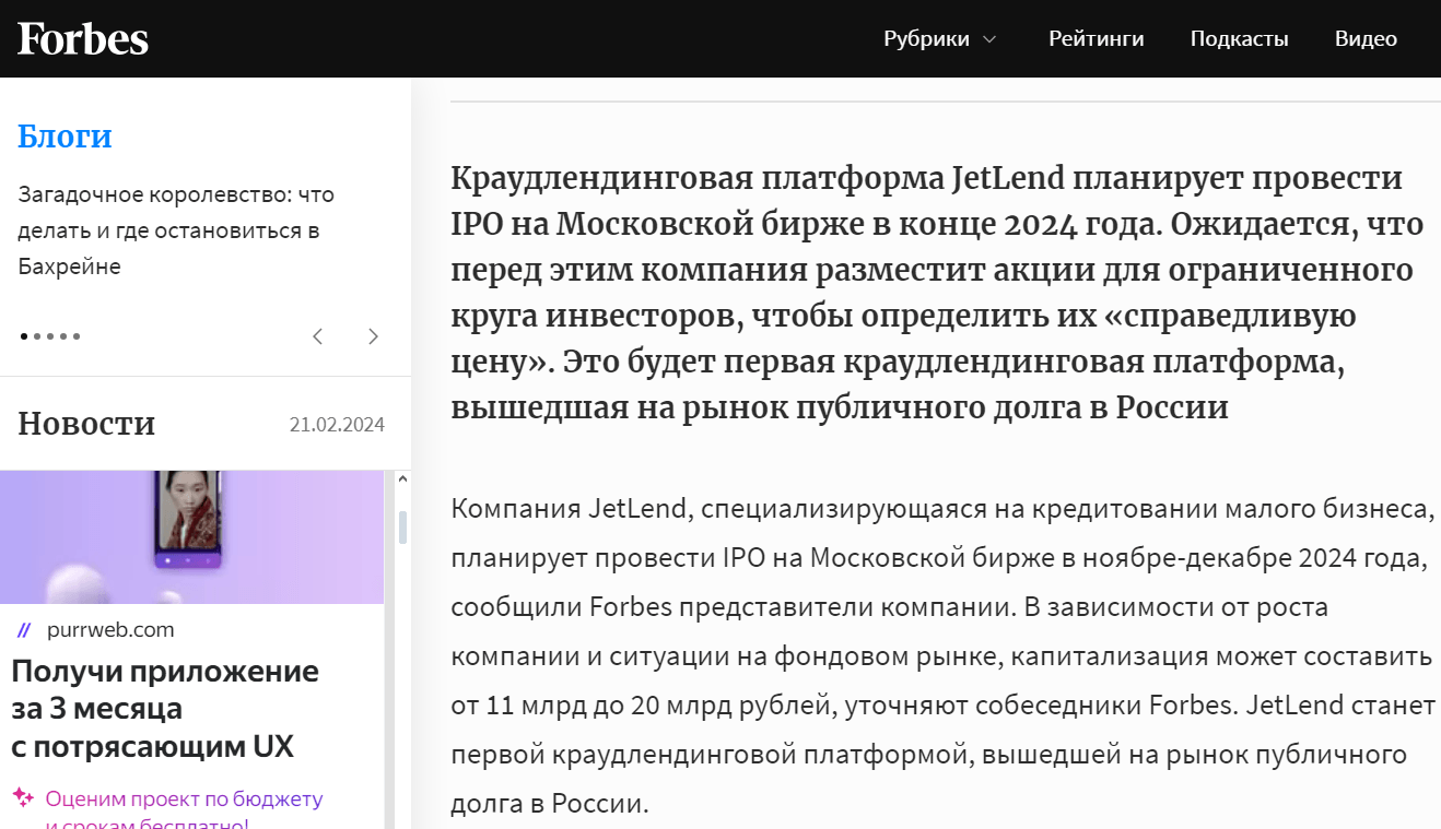 • Forbes. Мини-биржа: как сервис выходцев из «Сбера» стал игроком №2 на рынке краудлендинга
