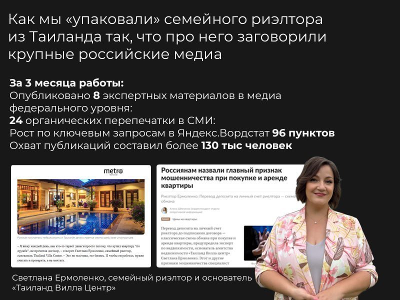 Вывести основателя агентства недвижимости в Таиланде в российское медиаполе и закрепить за ним позиционирование «семейный риэлтор» — надёжный, тёплый эксперт, которому можно доверить не просто сделку, а будущее под солнцем.