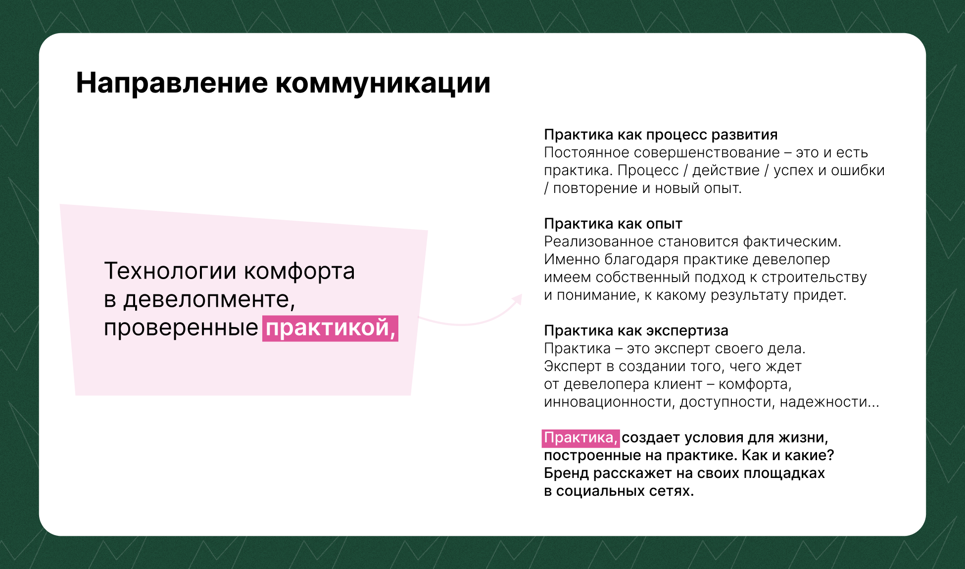 Компания впервые вышла на рынок с собственными проектами, поэтому мы сделали упор на формировании экспертного имиджа. Взяли главный посыл бренда и создали на его основе идею коммуникации: «Практика» — надежный застройщик не на словах, а на практике.